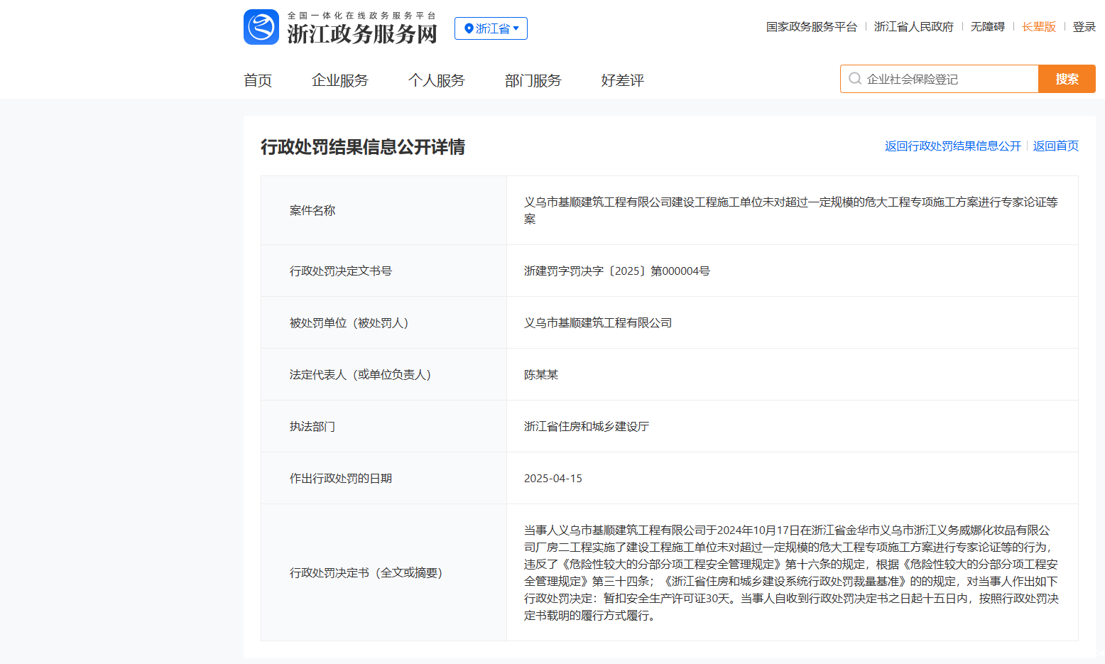 浙建罚字罚决字〔2025〕第000004号 义乌市基顺建筑工程有限公司建设工程施工单位未对超过一定规模的危大工程专项施工方案进行专家论证等案